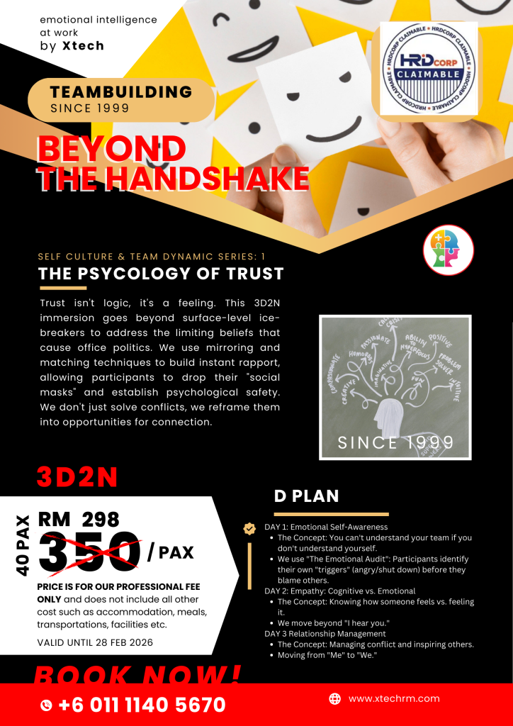 SYSNOPSIS: Trust isn’t logic, it’s a feeling. This 3D2N immersion goes beyond surface-level ice-breakers to address the limiting beliefs that cause office politics. We use mirroring and matching techniques to build instant rapport, allowing participants to drop their “social masks” and establish psychological safety. We don’t just solve conflicts, we reframe them into opportunities for connection.